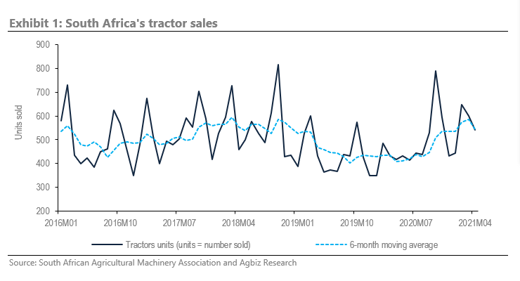 South Africa’s agricultural machinery sales have remained on a positive footing since May 2020. The figures released by the South African Agricultural Machinery Association last week show that tractors’ and harvesters’ sales were up by 23% y/y and 115% y/y in April 2021, with 540 and 40 units sold, respectively. Improved farmers’ finances have supported the sale. This is on the back of the large harvest in 2019/20, prospects for yet another good agricultural season in 2020/21, and higher commodities prices. The relatively stronger exchange rate has also been a positive buffer for the imported agricultural machinery.